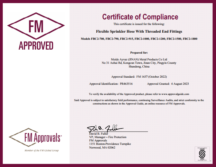 Meide clean room fire sprinkler hose (FBC5) successfully obtained the FM certificate
