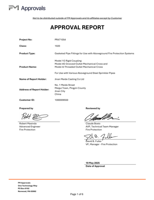 Meide Group's ductile iron grooved fittings in models 1G 457, 4G 273x76 / 273x114, and 4J 273x48 / 273x60 are FM approved.