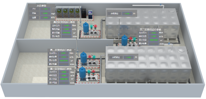系統(tǒng)對(duì)泵房運(yùn)行態(tài)勢(shì)、門禁狀態(tài)和視頻監(jiān)控三維可視化管理,實(shí)現(xiàn)泵房全方位管控。通過系統(tǒng)可以全面監(jiān)測(cè)泵房各項(xiàng)指標(biāo)數(shù)據(jù),確保供水系統(tǒng)穩(wěn)定運(yùn)行。對(duì)采集的海量數(shù)據(jù)進(jìn)行深度處理和分析,實(shí)現(xiàn)泵房潛在故障及時(shí)預(yù)警。系統(tǒng)可以實(shí)時(shí)對(duì)供水?dāng)?shù)據(jù)進(jìn)行監(jiān)控,實(shí)現(xiàn)錯(cuò)峰調(diào)蓄。可將泵房的歷史數(shù)據(jù)和運(yùn)行情況進(jìn)行展示,為管理者決策提供精準(zhǔn)的數(shù)據(jù)支持,同時(shí)當(dāng)系統(tǒng)監(jiān)測(cè)到泵房異常時(shí),會(huì)自動(dòng)智能識(shí)別并發(fā)出警報(bào),使運(yùn)維人員快速響應(yīng),減少事故損失,實(shí)現(xiàn)風(fēng)險(xiǎn)快速感知、一站調(diào)度,及時(shí)解決問題。